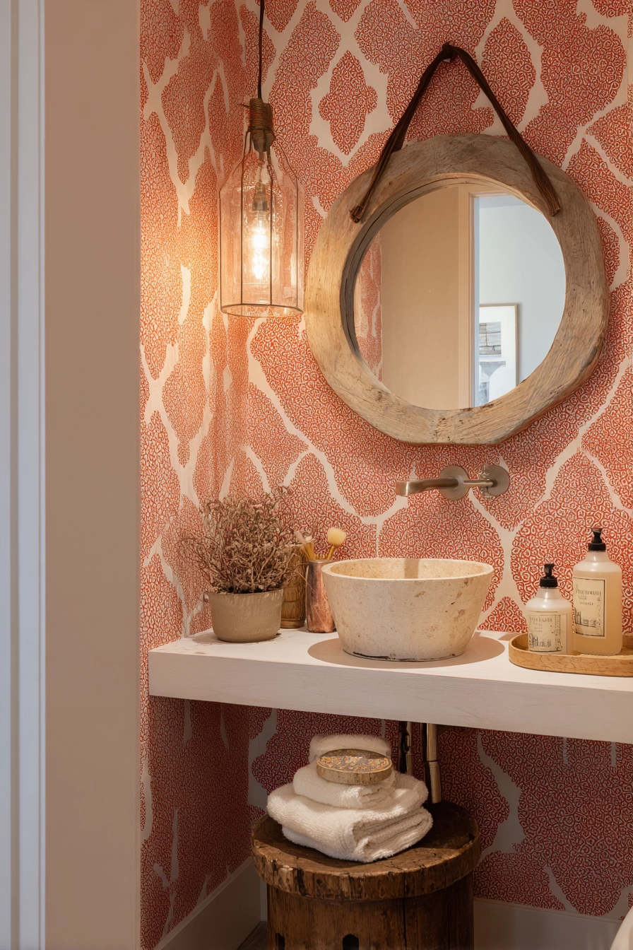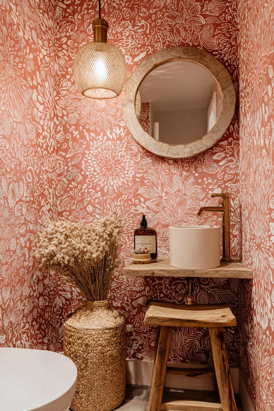 Embrace the eclectic charm of this chic toilet area, which showcases a vibrant bohemian touch through colorful patterned wallpaper in shades of terracotta and cream. A small vintage stool, holding a collection of natural bathroom accessories, adds both functionality and character.
