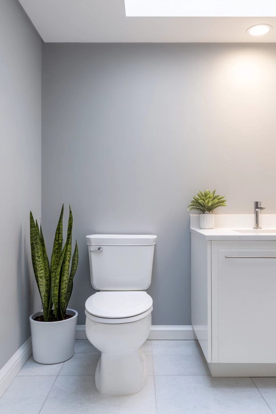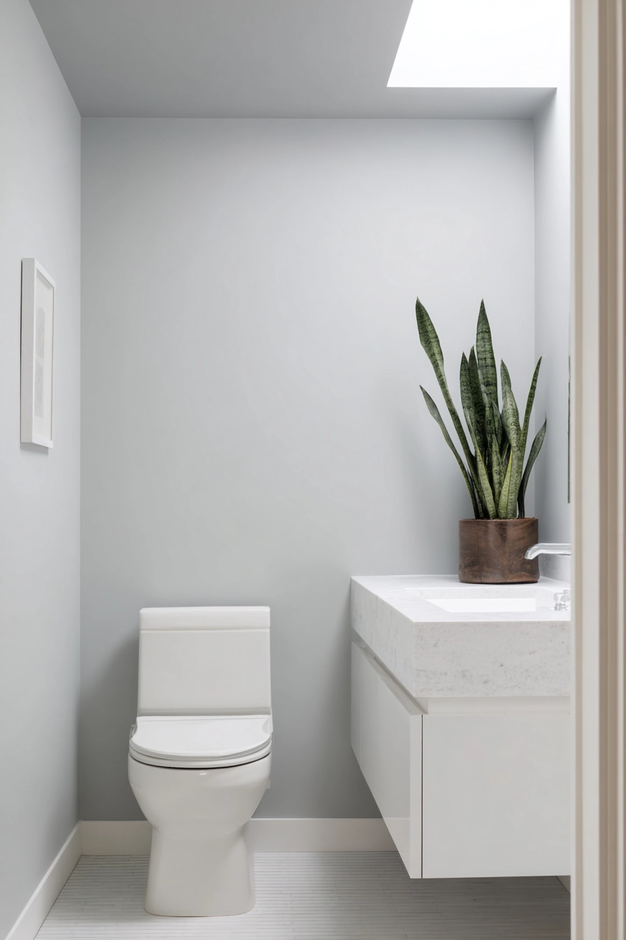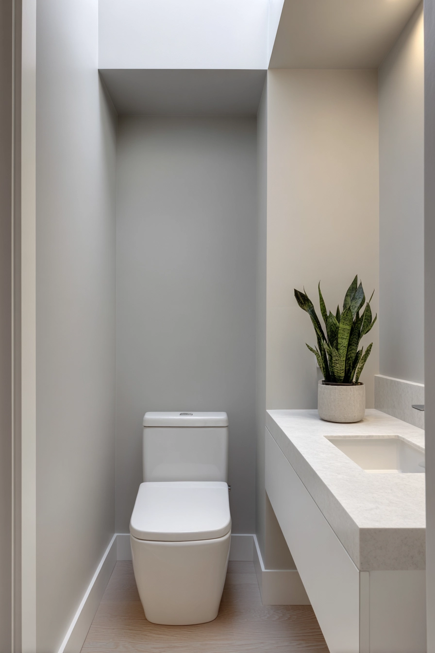 This minimalist toilet area is a perfect example of how less is more, showcasing clean lines and a monochromatic color scheme. The soft grey walls create a tranquil backdrop, while a simple white toilet and a floating vanity with a quartz countertop complete the sleek look.