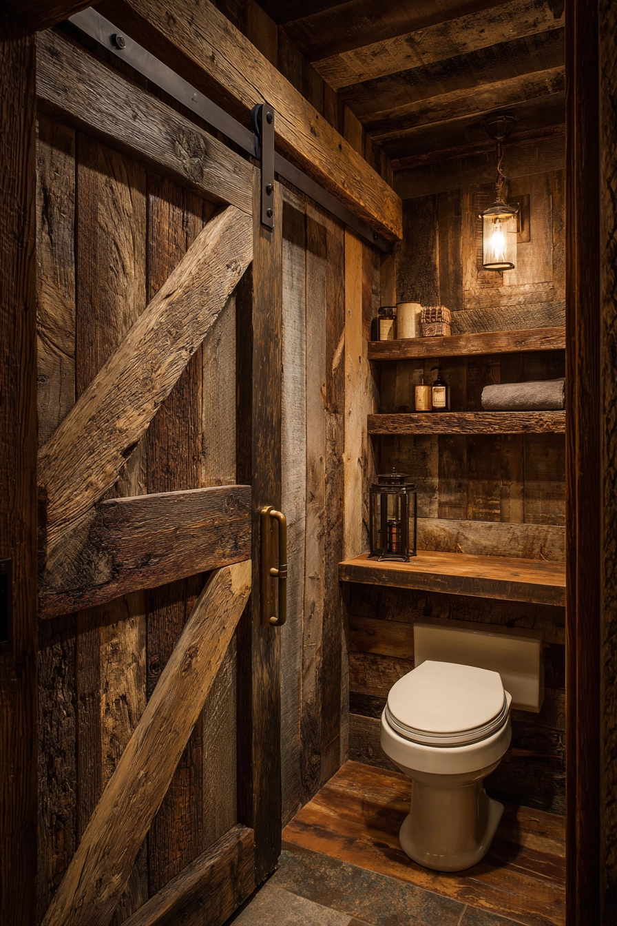 Soft warm lighting creates a cozy ambiance, making this space feel inviting and homely. The barn-style sliding door adds an element of charm and functionality, seamlessly blending the rustic elements.