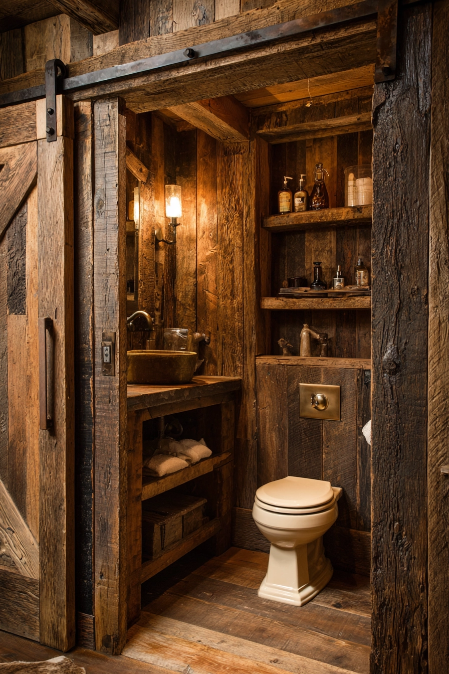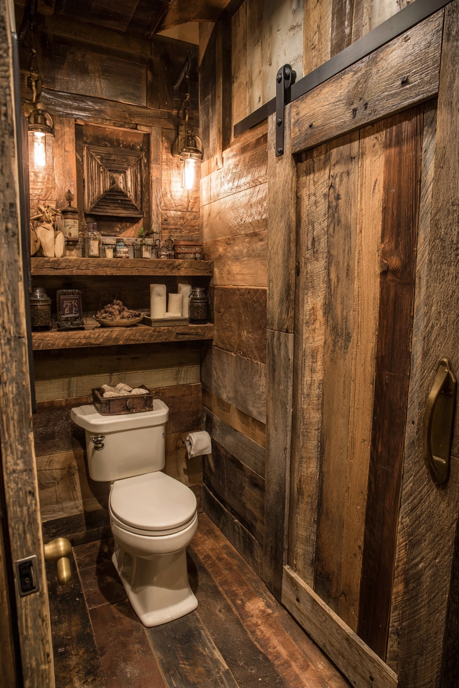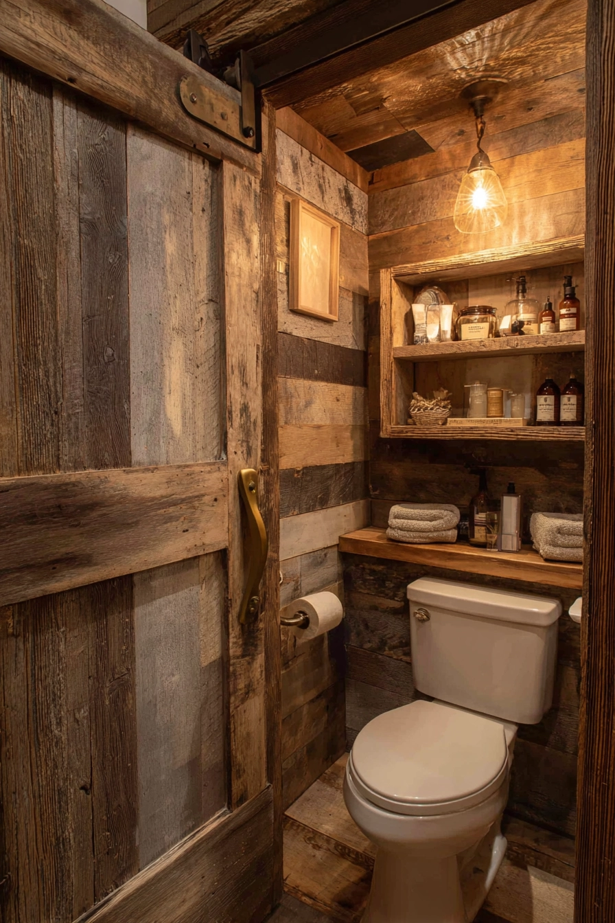 Step into a rustic toilet area that captures the essence of farmhouse style, featuring reclaimed wood paneling that adds warmth and character. A vintage brass flush handle on the toilet introduces a touch of nostalgia, while a small wooden shelf is filled with neatly organized toiletries and charming rustic decor accents.